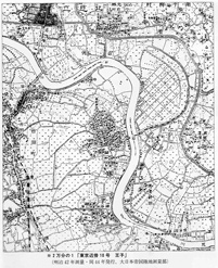 明治末の放水路開削前(下左図)は、赤羽に鉄道が通り、下村も岩淵も集落が拡大しています。荒川対岸のグリッド状の土地は、下村と岩淵の入会地(いりあいち)だった飛地、梛野原新田(なぎのはらしんでん)です。放水路開削にともない、志茂地区の3分の1は河川敷用地として売却、志茂と岩淵の間の田んぼは、開削時に出る土砂を入れて宅地化されました。