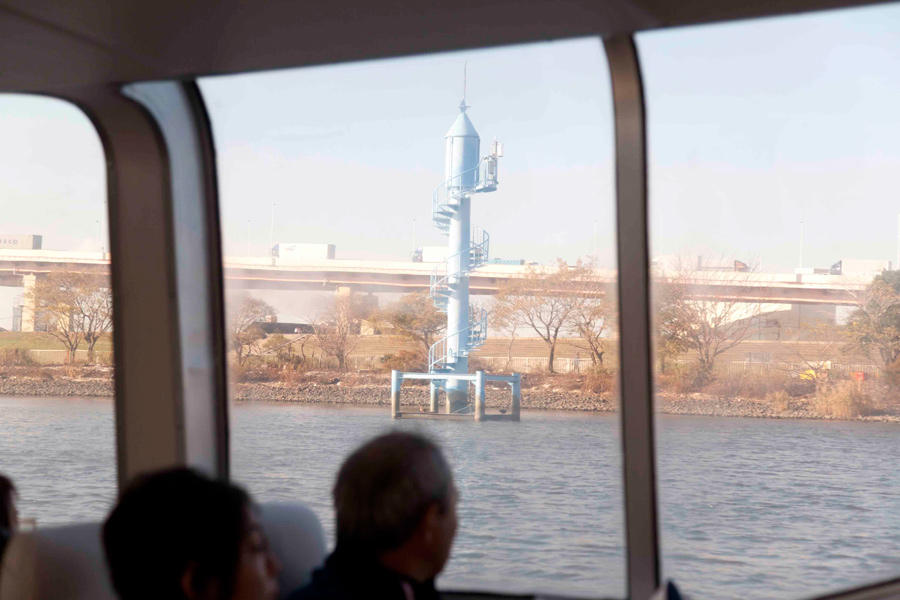 旧中川から今度は閘室の水位を上げて荒川に戻りました。ロックゲートの通過体験後、船はさらに下流へ。清砂大橋をくぐると、中川との合流点が荒川ゼロkm地点。以前はここが河口でしたが、埋め立てによって川の長さが4km延び、ここから先は、マイナス1km、マイナス2km……と数えるそうです。