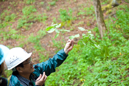「日本にはカエデが26種類くらいありますが、だいたい20種はここらへんですぐ見つかります。それくらいカエデが多い。いちばんカエデの中では葉が大きいメグスリノキもあります。その名の通り薬木(やくぼく)ですが、一時期さかんに盗伐にあいました。樹皮を煮出して飲むと肝臓や目に効くからですね」