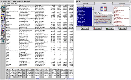 データベースは漁獲や養殖、輸出入などといった項目別に取りそろえられていて、年、国、品目(魚種や加工品)、産地(地域や海域)ごとの生産量や金額の数値を一覧表示することができる(メイン画面)。目的の統計資料を作成するには、これらにフィルターをかけたり(フィルター操作画面)、並べ替えや表示項目の設定などを操作する。