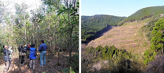 「ここも、もともとは照葉樹の森でした。国はこの照葉樹林を皆伐して、杉や檜を2回植えました。2回目の伐採を終えたのが14年前です。13年前に国有林と愛林館が分収林(他人の所有地を借りて、森を育てる)契約をして、植林しました。ある程度年数が経ったら皆伐して売り上げを分けます。貸与年数と分配率は契約時に決めます。この場合は、80年で30%です」