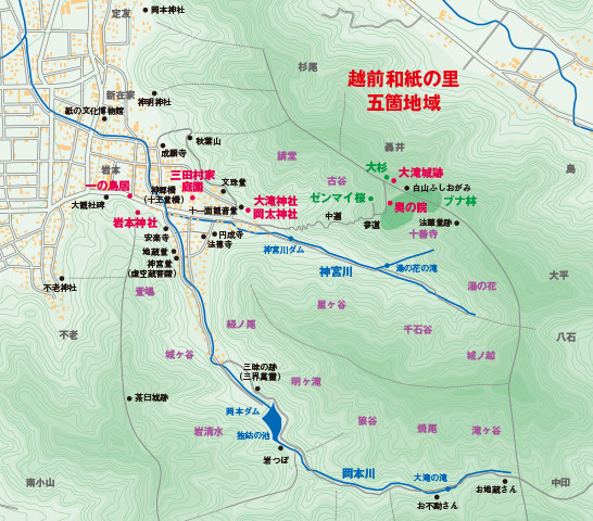 越前和紙の産地は、古代律令制のもとに置かれた今立郡(いまだてこおり)九郷の内、味真野(あじまの)郷に属した〈五箇の庄〉に開けました。国府が置かれた武生(たけふ)の東方、10km程に位置します。