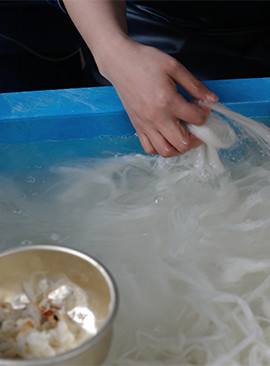 「でんぷん質ですから、虫が喰ったりして劣化が進みます。それでうちでは、そのでんぷん質をすっかり洗い流しています。豆腐づくりに使う木綿布より、少し粗目の布で材料を包んで、水に晒しながらすっかり流してしまう。そのときにも、ものすごく水が必要になります」