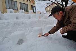 基本的には町会ごとや地域でつくっていたのですが、通行の邪魔になるということで、一時期規制がかかったときがありました。それ以降、つくる人が減ってしまって、技術が廃れそうになったのです。それでかまくら職人という役職をつくって、観光協会で募集するようになりました。今年も20人が任命されています。かまくら祭に向けて、3週間ぐらいの間に、20人で100基のかまくらをつくるんですよ。