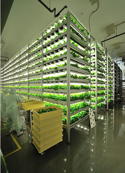 人工光で生産する一番のメリットは、耕作に適さない土地を有効利用できることにあります。人工光を使えば、密集して植えたものを立体的に設置することが可能になり、単位面積あたりの収穫が飛躍的に高まるからです。
