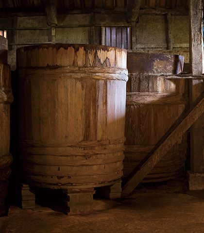 しょうゆをつくってくれる乳酸菌や酵母菌は、もちろん肉眼で見えない。だが小豆島のヤマロク醤油のもろみ(注)蔵に入ると、菌が成長した姿を目にすることができる。杉材の巨大な木桶にこびりついた、おびただしい量の菌糸体。最古で150年も経た木桶のみならず、蔵の至るところに100種類以上の微生物が棲みついている。2年~4年半かけ木桶で発酵熟成させた「菊醤(きくびしお)」「鶴醤(つるびしお)」の深いうまみは、長い時をかけてこの蔵特有の生態系を形づくった微生物のおかげにほかならない。