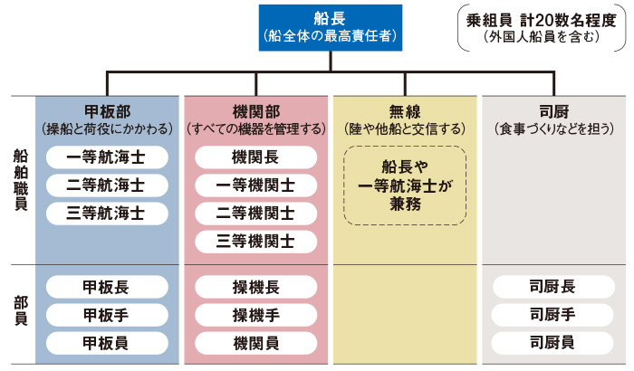 日本と外国との間で物や人を運ぶ「外航海運」の場合、一つの船には、船長以下、一等から三等まで3人の航海士(甲板部)、1人の機関長と一等から三等まで3人の機関士(機関部)が乗り組みます。貨物船の場合、船舶職員と部員を合わせ、外国人を含めて総勢二十数名程度の乗組員で運航することが多いです。その船舶職員の下には、甲板部、機関部それぞれに「部員」が配属されます。司厨(しちゅう)(調理場)のスタッフも部員です。部員に海技士免許は必要ありません。
