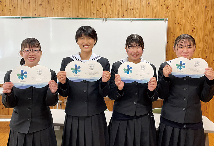 熊本市で中高一貫教育を行なっている尚絅高校は環境教育に熱心で、阿蘇市門前町の水基巡りや下草刈り体験、閘門(こうもん)・水源見学などに中学生から取り組んでおり、英語教育にも定評が高い。YWFKには2グループが参加し、いずれも質の高い動画作品を制作している。この日は2年生7名が出席した。
